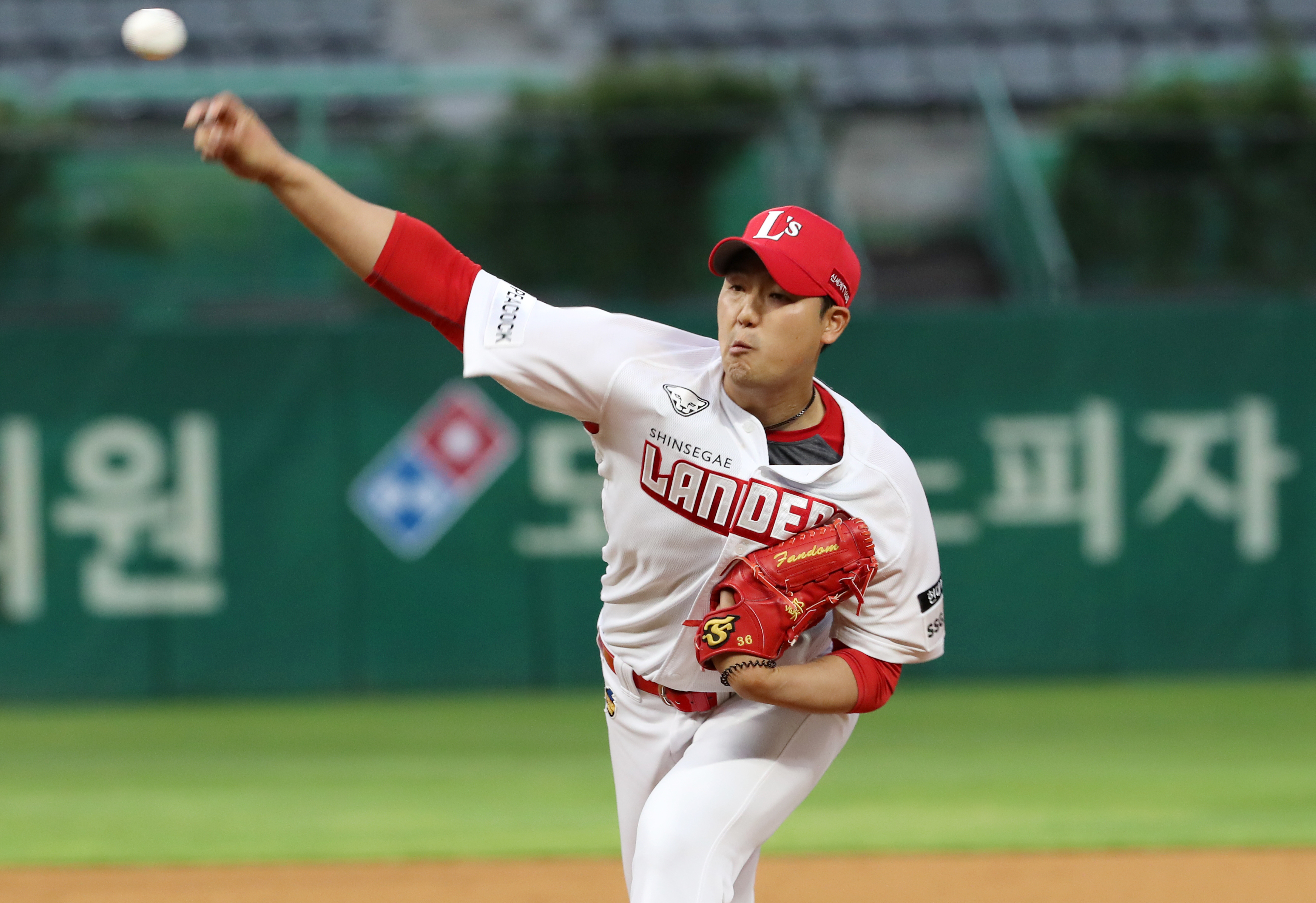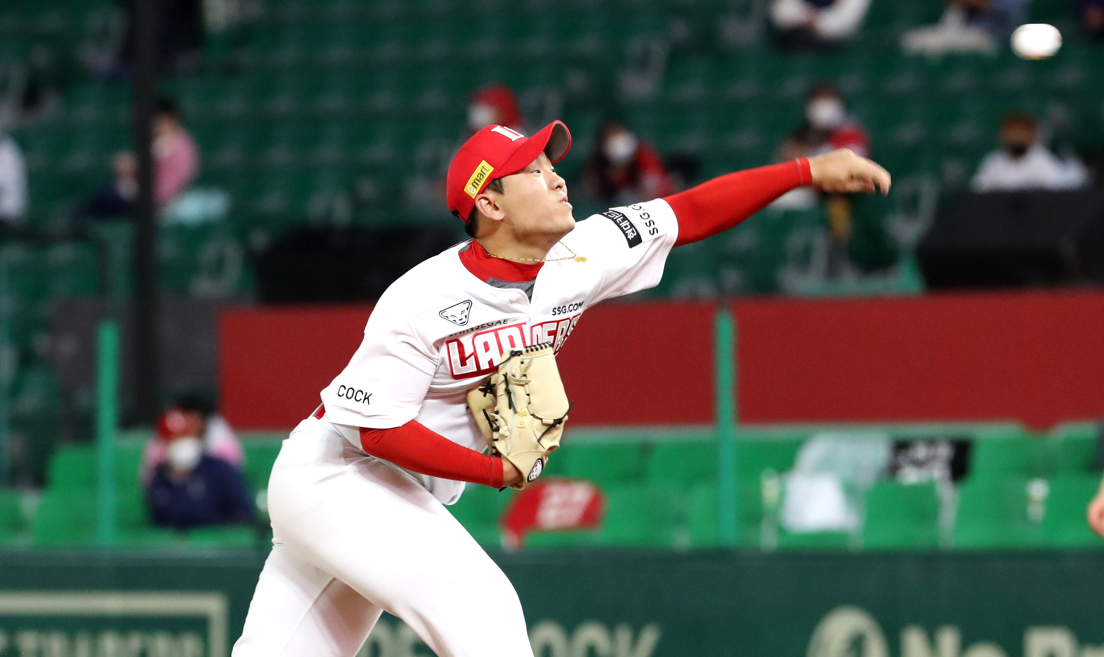 지난 4월 27일 SSG 랜더스의 선발 투수 정수민이 KT와의 경기에서 투구하고 있다.