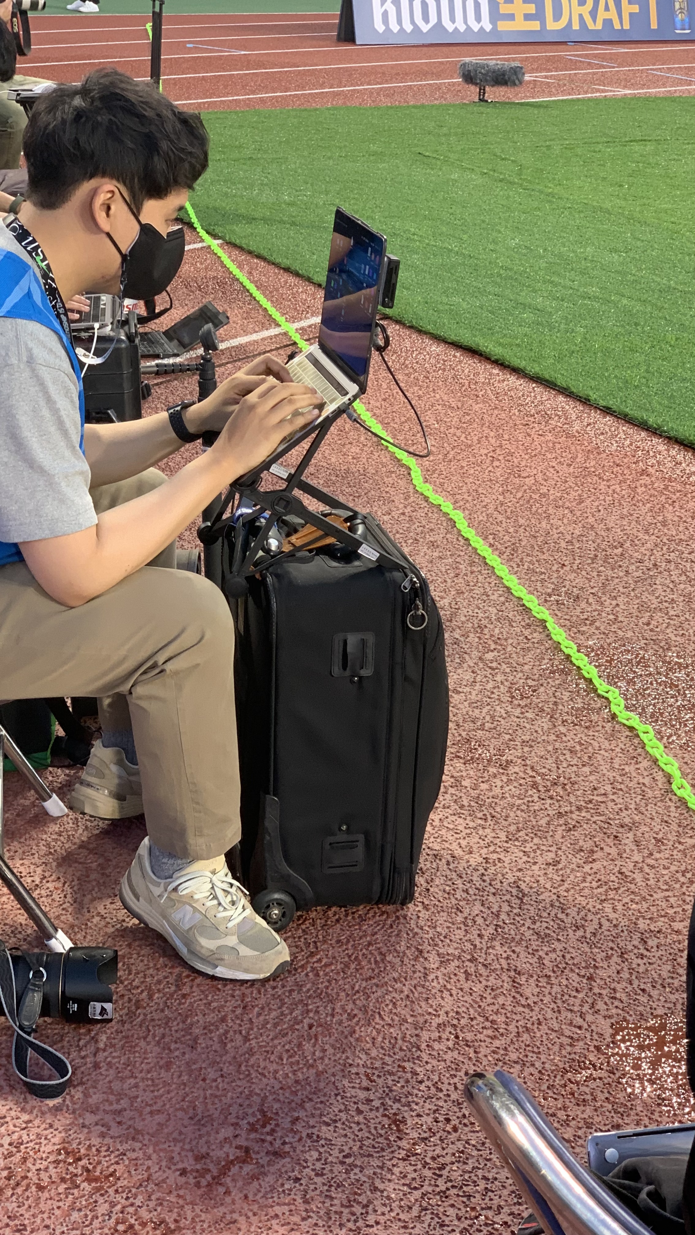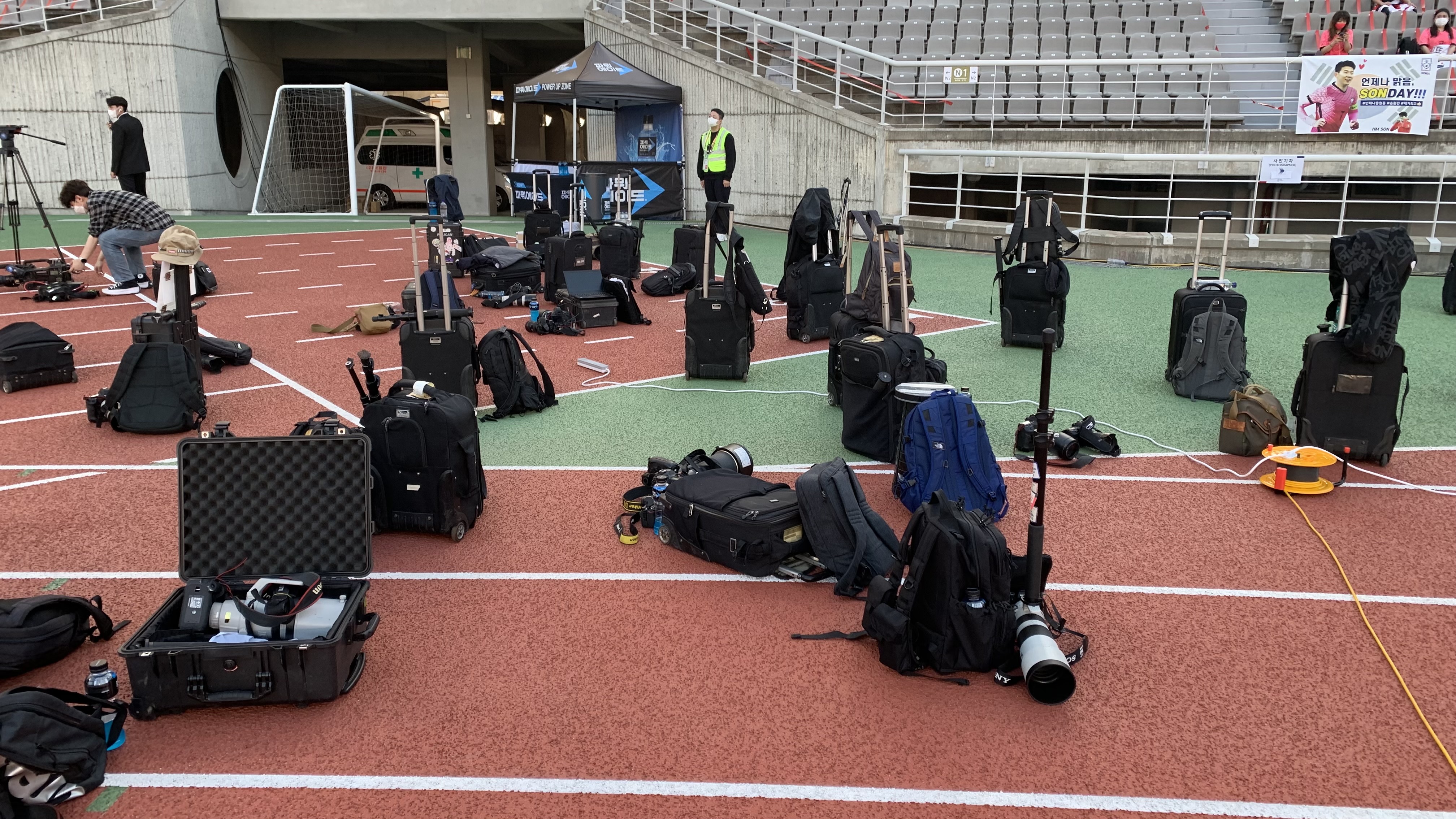 사진기자들의 취재 장비가 담긴 여행 가방이 운동장 한편에 놓여 있다. 사진기자들은 보통 카메라 장비를 여행 가방(캐리어)에 넣고 다닌다. 장비 무게가 만만치 않기 때문이다.